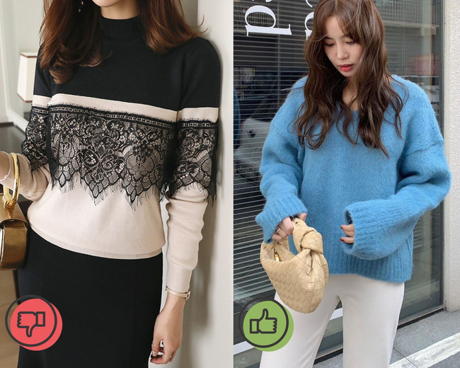 Khi đi mua sắm áo len, chị em sẽ rất dễ bắt gặp những thiết kế áo điệu đà, và áo len đính ren chính là một trong số đó. Thoạt nghe, mẫu áo này hứa hẹn có thể mang đến vẻ ngoài nữ tính, hút mắt cho người diện nhưng thực tế lại rất khác. Áo len đính ren sẽ khiến chị em trông "dừ" đi. Đó còn chưa kể, một số kiểu áo len đính ren rối mắt, mang gam màu lòe loẹt còn khiến vẻ ngoài bị "sến rện", nên không phải là khoản đầu tư sáng suốt của chị em.