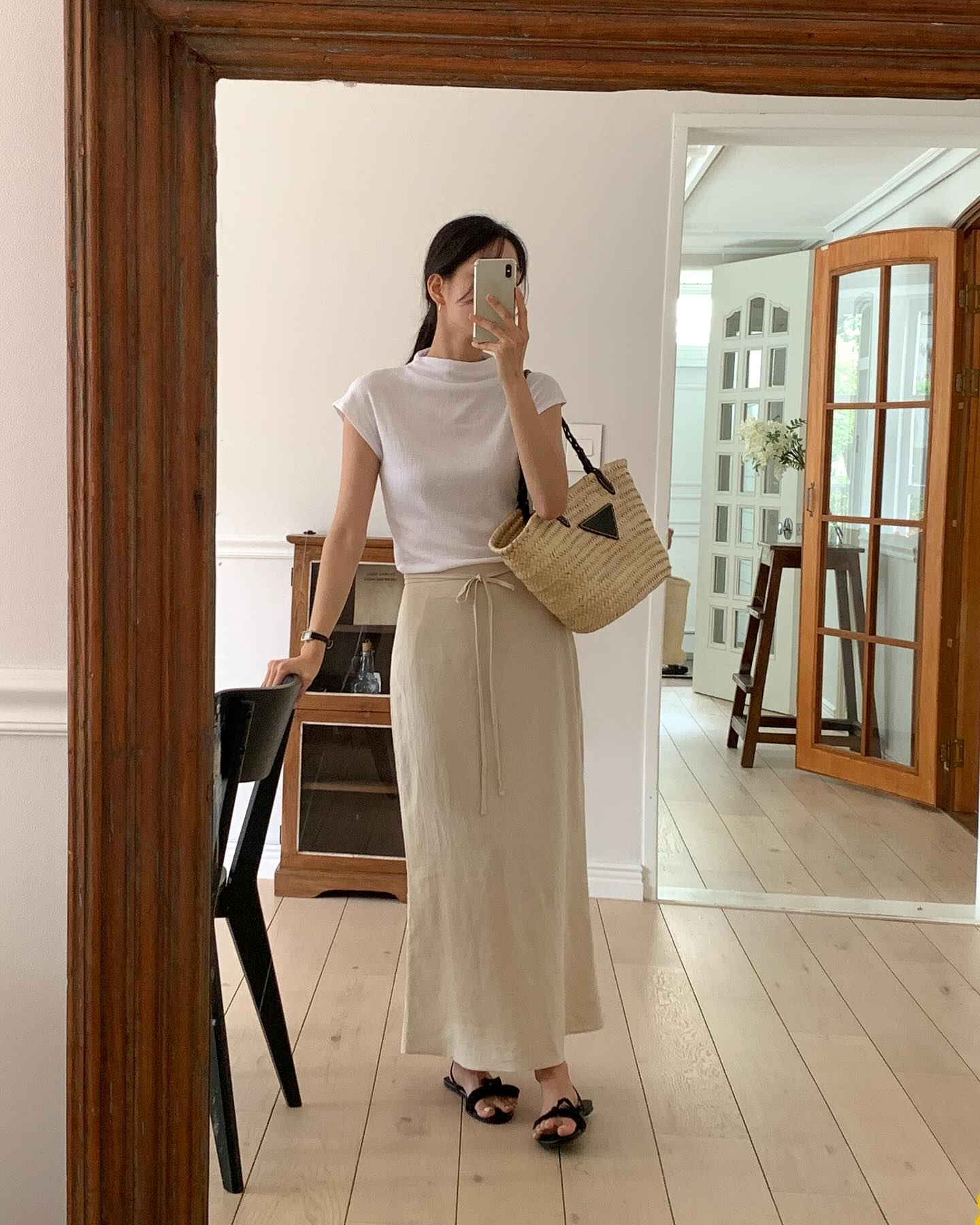 Công thức áo thun trắng và chân váy vải thô đũi khá đơn giản, nhưng vẫn giúp người mặc ghi điểm phong cách. Ấn tượng về combo này chính là sự trẻ trung xen lẫn nét dịu dàng, trang nhã. Bộ trang phục thêm bay bổng khi được hoàn thiện bằng chiếc túi cói.