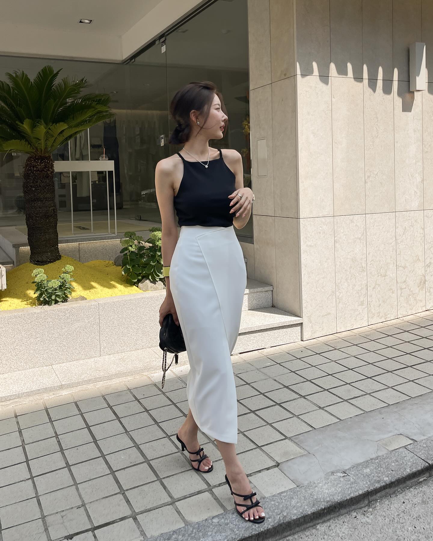 Làm thế nào để trông thật tinh tế, trang nhã khi diện áo hai dây? Câu trả lời chính là kết hợp mẫu áo này với chân váy trắng dáng suông. Tổng thể trang phục càng thêm sang trọng khi người diện sơ vin và đi sandal cao gót.