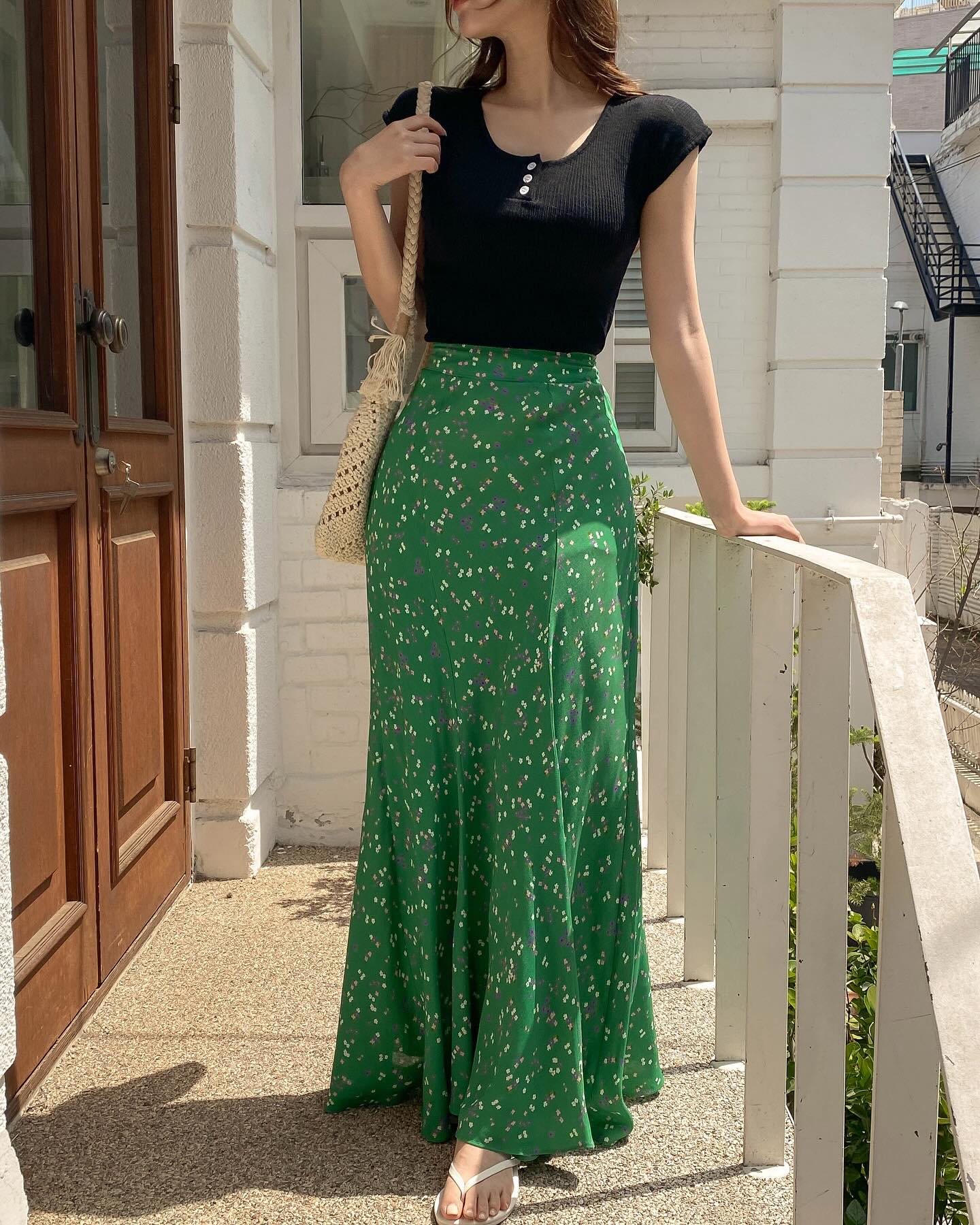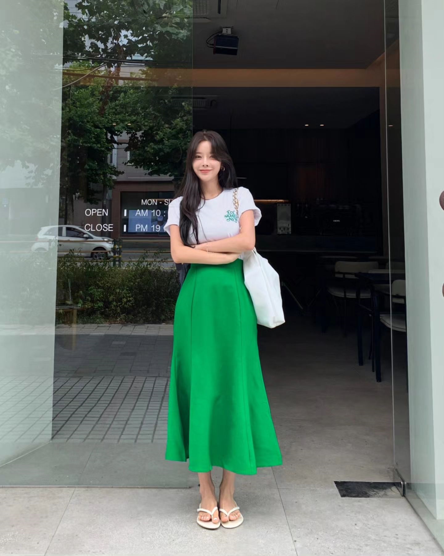 Các nàng đừng bỏ qua những mẫu chân váy mang màu sắc rực rỡ khi xây dựng thời trang mùa hè. Món đồ này tạo điểm nhấn nổi bật, bắt mắt cho phong cách. Với mẫu chân váy màu xanh lá cây, các nàng hãy kết hợp cùng áo thun, túi xách và dép xỏ ngón cùng tông màu trắng để cân bằng outfit, mà hiệu quả "hack" tuổi vẫn được giữ nguyên.