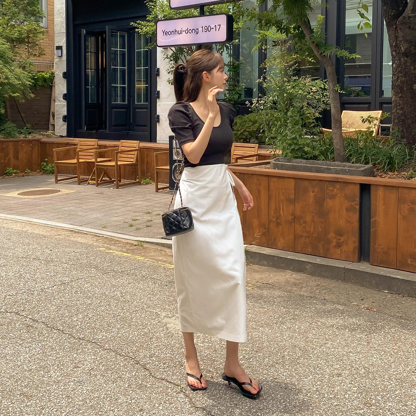 Công thức áo đen tay bồng và chân váy trắng mang đậm nét nữ tính. Các quý cô có thể diện combo trên khi đi cà phê cuối tuần hoặc hẹn hò buổi tối lãng mạn. Hiệu quả tôn dáng được tăng thêm nhờ đôi sandal xỏ ngón, cao gót.