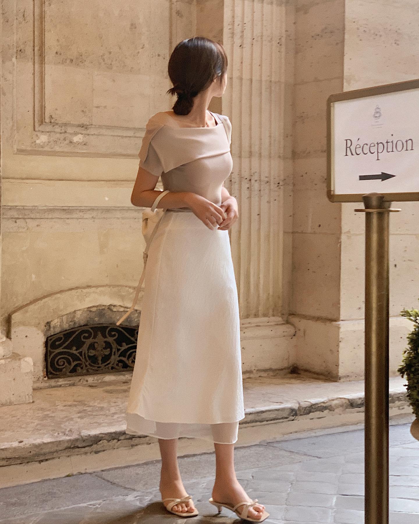 Áo trắng trễ vai và chân váy màu be đã tạo nên bộ trang phục đầy trẻ trung, trang nhã. Muốn tôn dáng tối ưu, chị em nên sơ vin và hoàn thiện outfit bằng một đôi sandal cao gót quai ngang. Một đôi khuyên tai ngọc trai đơn giản sẽ góp phần nâng tầm vẻ yêu kiều, sang trọng cho tổng thể bộ cánh.