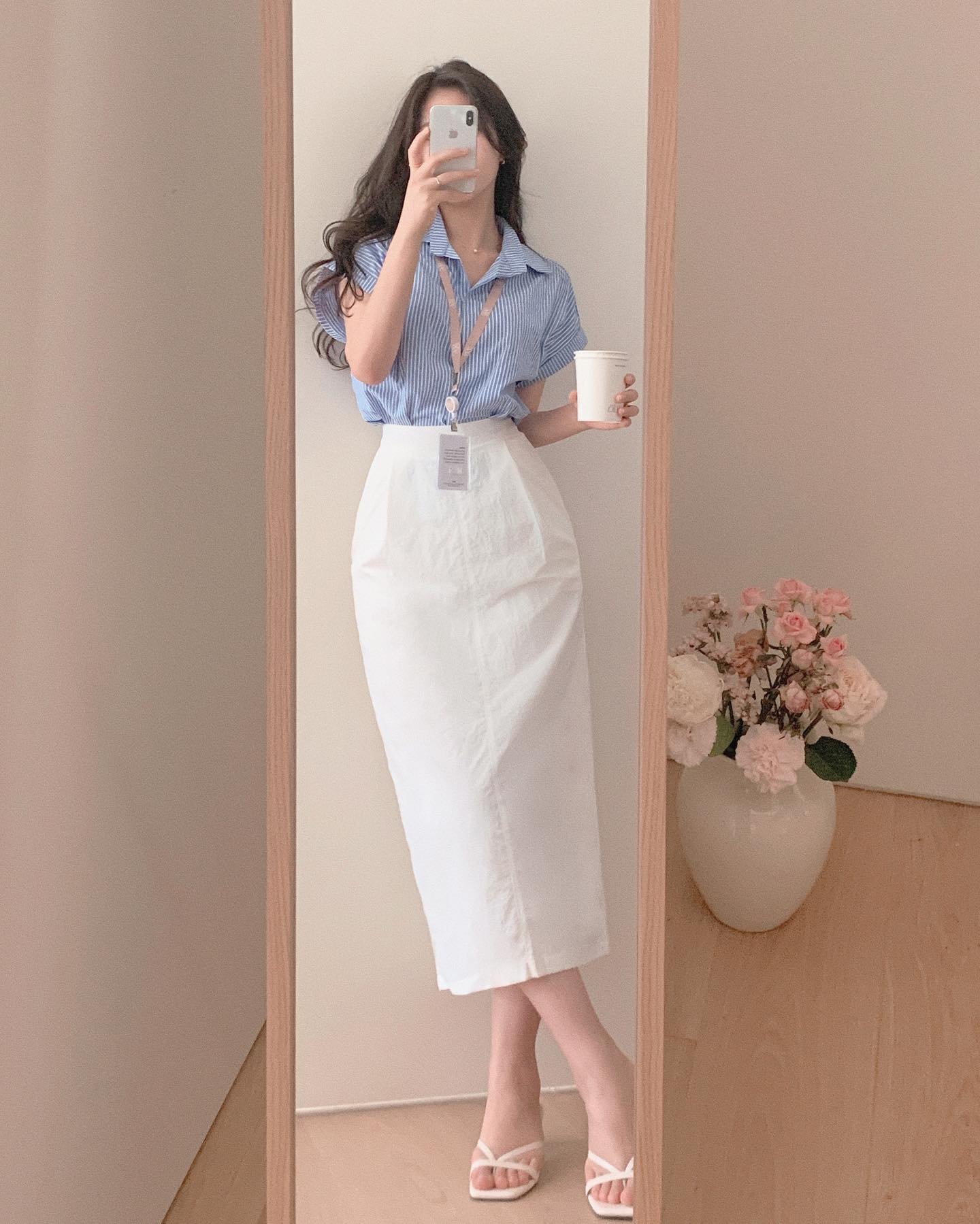 Chị em không nên bỏ qua xu hướng áo sơ mi kẻ sọc khi hoàn thiện phong cách mùa hè. Mẫu áo nổi bật này kết hợp rất ăn ý với chân váy trắng, giúp người mặc có được vẻ ngoài trẻ trung, năng động. Bộ cánh trên còn toát lên sự thanh lịch, chị em có thể áp dụng tới công sở.