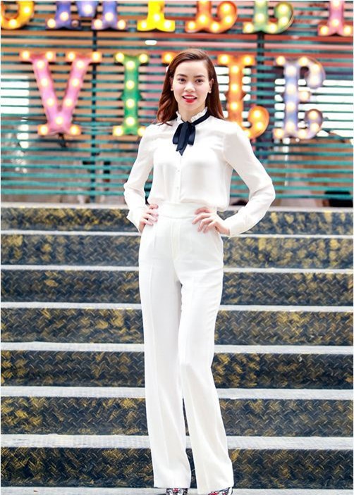 Chiếc sơ mi trắng quen thuộc được mix kèm dải khăn lụa mảnh mai giúp Minh Hằng trở nên đầy cá tính.