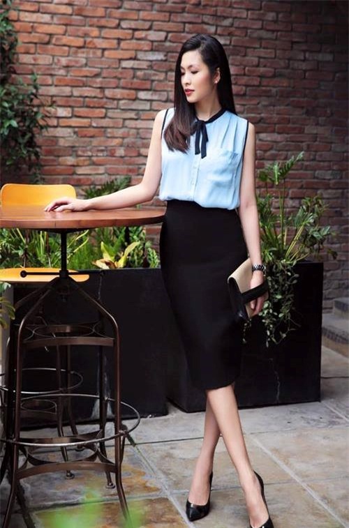 Hà Tăng gợi ý cho thời trang công sở với sơ mi xanh thắt nơ mix kèm chân váy bút chì duyên dáng.
