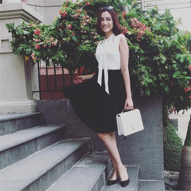 Hà Hồ chọn cả cây trắng với chiếc nơ lụa làm điểm nhấn nổi bật giúp tôn vẻ dịu dàng cho trang phục.