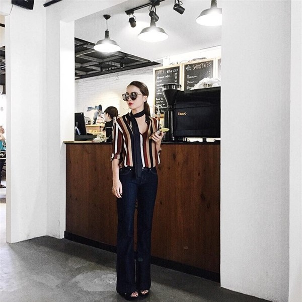 Yến Trang với sơ mi kẻ và nơ lụa thắt lệch mang phong cách mùa thu ấn tượng.