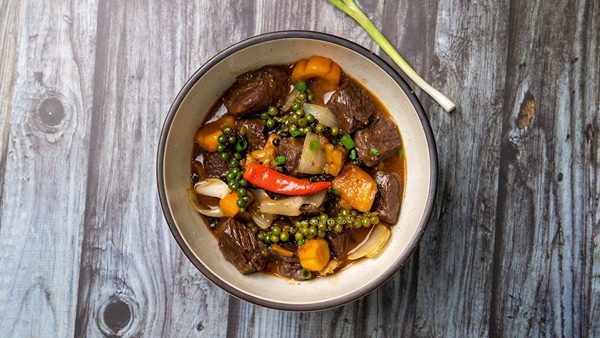 - Thịt vai bò với phần nạc mềm, có thêm chút gân sần sật, thấm vị, kết hợp với tiêu xanh thơm lừng