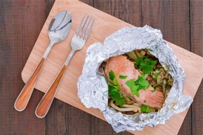 ![]() | ![]() Gấp giấy bạc lại, bọc kín các mép và góc cạnh. Cho lượng nước vào chảo hoặc nồi với mực nước cao khoảng 0,6cm. Cho túi cá hồi vào rồi đậy nắp đun sôi. Khi nước sôi hạ nhỏ lửa đun thêm khoảng 9-10 phút để cá hồi chín là được. |