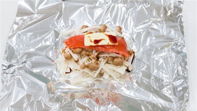 ![]() | ![]() Bạn cắt một tấm giấy bạc to hình chữ nhật, cho các loại nấm đã sơ chế vào giữa tấm giấy nhôm rồi đặt cá hồi lên trên. Đặt lát bơ nhạt lên trên cá hồi tiếp đó rưới nước tương lên trên. |