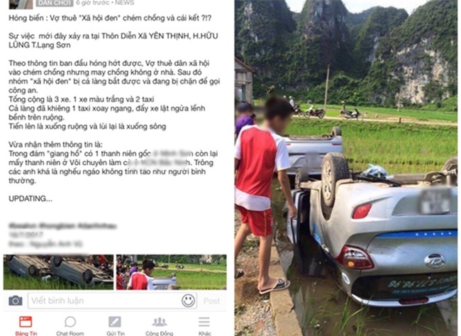 Ngày 17-7, Công an huyện Hữu Lũng, Lạng Sơn cho biết đang triệu tập lấy lời khai của nhóm thanh niên liên quan đến vụ việc mới được chia sẻ trên các mạng xã hội về hình ảnh 2 chiếc xe ô tô bị lật ngửa nằm dưới ruộng ven đường thuộc địa bàn xã Yên Thịnh, huyện Hữu Lũng, tỉnh Lạng Sơn, kèm hình ảnh, tài khoản mạng này thông tin nguyên nhân dẫn tới sự việc là do vợ thuê xã hội đen vào hành hung chồng.