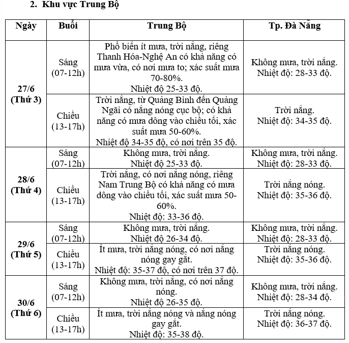 Dưới đây là dự báo chi tiết các vùng trên cả nước các ngày 27-30/6: