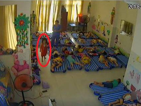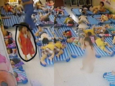 Trong lúc ngủ, bé ị đùn và được bảo mẫu đưa vào nhà vệ sinh (Ảnh cắt từ clip)