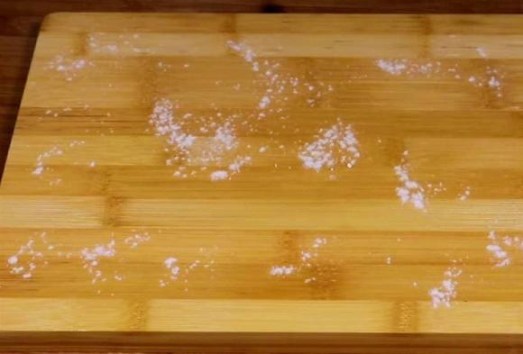 Bỏ màng bọc thực phẩm ra, lúc này dầu trên thớt đã ngấm gần hết rồi ta cho thớt vào thau nước nóng, sau đó đổ một ít muối nở (baking soda) vào, dùng nước nóng và muối nở để lau thớt. Khi vệ sinh thớt lần đầu, tốt nhất bạn không nên dùng chất tẩy rửa để làm sạch mà nên dùng baking soda hoặc muối ăn để làm sạch.