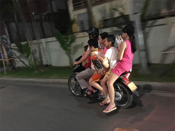 Thậm chí để có thể “ních” đủ 5 cháu bé, người đàn ông đã cho một em nhỏ ngồi lên khung xe phía trước, 4 cháu khác ngồi sát phía sau. Riêng bé gái lớn nhất ngồi ngoài cùng những tưởng như có thể rời ra khỏi yên xe bất cứ lúc nào.