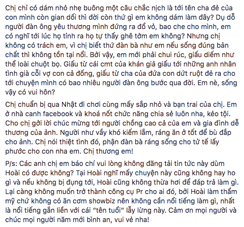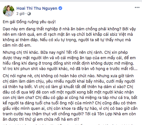 Thu Hoài viết: "Chị nói nghe nè, chị không có hoàn hảo chút nào. Nhưng xưa giờ tánh chị dám làm dám chịu, yêu nhiều người khai bấy nhiêu, cưới mấy người cả thiên hạ biết. Vì chị có làm gì khuất tất để thiên hạ dám xì xào? Chị đâu có đi qua Mỹ đẻ con với một người xong bắt một người khác nhận con chị làm cha? Chị đâu có gặp ai cũng há miệng ra táp như cá tra, bất kể người ta đáng tuổi cha tuổi ông nội của mình? Chị cũng đâu có thèm giấu việc mình quen ai, chị còn khoe ra đầy tự hào, vì chị có bao giờ cần tranh cướp hay thậm thụt với chồng người? Tới cả Tôn Lợp Nhà em còn ăn được thì thứ gì em chừa nổi hả em ơi?