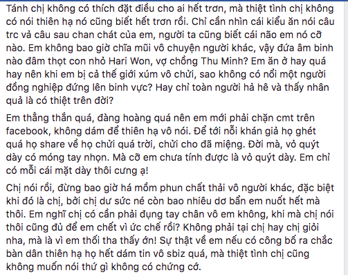 Tánh chị không có thích đặt điều cho ai hết trơn, mà thiệt tình chị không có nói thiên hạ nó cũng biết hết trơn rồi. Chỉ cần nhìn cái kiểu ăn nói câu trước vả câu sau chan chát của em, người ta cũng biết cái não em nó cỡ nào. Em không bao giờ chĩa mũi vô chuyện người khác, vậy đứa âm binh nào đâm thọt con nhỏ Hari Won, vợ chồng Thu Minh? Em ăn ở hay quá hay nên khi em bị cả thế giới xúm vô chửi, sao không có nổi một người đồng nghiệp đứng lên binh vực? Hay chỉ toàn người hả hê và thấy nhân quả là có thiệt trên đời?