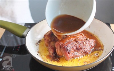 Đỗ hỗn hợp đã pha vào chảo thịt. Lúc này hãy hạ nhỏ lửa để gia vị từ từ thấm vào thịt đồng thời làm miếng thịt chín mềm hơn. Sau khoảng 20-25 phút, nước sốt trong chảo hơi sệt lại là được. |