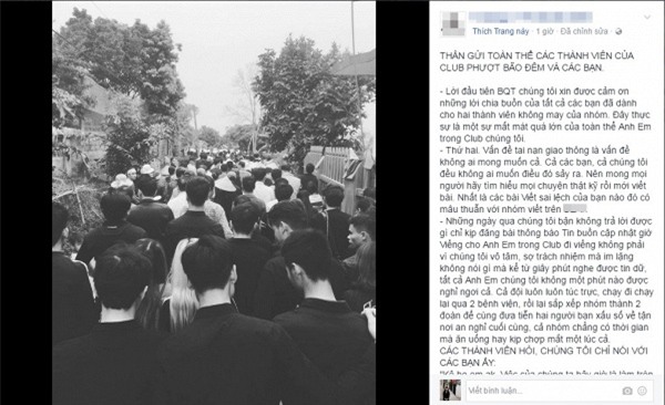 Những ngày qua chúng tôi bận không trả lời được gì chỉ kịp đăng bài thông báo tin buồn, cập nhật giờ viếng cho anh em trong club đi viếng không phải vì chúng tôi vô tâm, sợ trách nhiệm mà im lặng không nói gì. Mà kể từ giây phút nghe được tin dữ, tất cả anh em chúng tôi không một phút nào được nghỉ ngơi cả. Cả đội luôn luôn túc trực, chạy đi chạy lại qua 2 bệnh viện, rồi lại sắp xếp nhóm thành 2 đoàn để cùng đưa tiễn hai người bạn xấu số về tận nơi an nghỉ cuối cùng…”