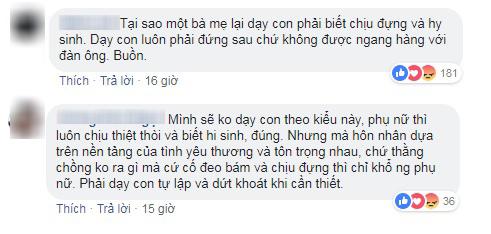 Song, cũng có rất nhiều ý kiến trái chiều xung quanh quan điểm của người mẹ trong bài viết này. Bạn Nhật Linh tỏ ý thắc mắc: “Vì sao một người mẹ lại dạy con gái phải chịu đựng hy sinh, phải hy sinh và không bao giờ được ngang hàng với đàn ông?”.