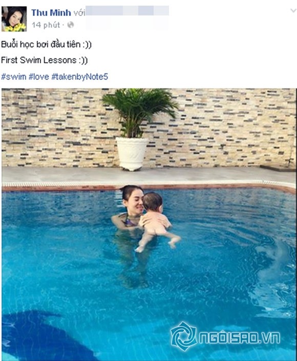 Trong ảnh, Thu Minh đang bế con tập bơi. Dù mới khoảng 8 tháng tuổi nhưng trông bé rất bụ bẫm và bạo dạn. Nữ giám khảo Vietnam Idol 2015 cũng cho con tiếp xúc sớm với môi trường xung quanh và có cách nuôi dạy rất khoa học khiến nhiều người khen ngợi. Fans bình luận: "Hai mẹ con đều rất đáng yêu"; "Gấu con bạo dạn quá"; "Một bà mẹ thật tuyệt vời"...