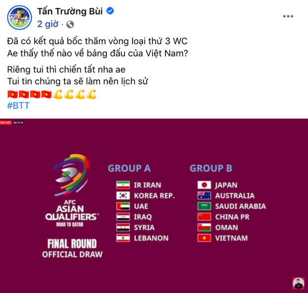 Sau kết quả bốc thăm thi đấu, tối nay (1/7), thủ môn Bùi Tấn Trường đã có phản ứng gây chú ý trên trang cá nhân. Theo đó, Bùi Tấn Trường chia sẻ lịch thi đấu cụ thể, thông báo với khán giả: "Đã có kết quả bốc thăm vòng loại thứ 3 World Cup. Anh em thấy thế nào về bảng đấu của Việt Nam? Riêng tui thì chiến tất nha anh em. Tui tin chúng ta sẽ làm nên lịch sử".