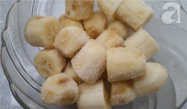 Chuối bóc vỏ, cắt làm những khoanh bằng nhau dày chừng 2,5-3cm. Ướp chuối với 1/2 lượng đường để chuối đậm đà hơn.