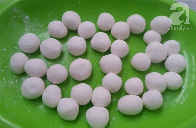 Bột nếp cho vào tô với chút nước ấm, nhào mịn sau đó viên thành những viên nhỏ bằng nhau.