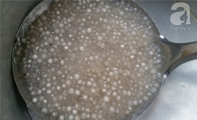 Đun một nồi nước sôi trên bếp, thả bột báng vào luộc chín. Khi bột báng nở đều, nổi lên, trong suốt thì vớt ra cho vào nước lạnh để bột báng không dính vào nhau.