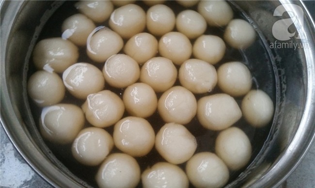 Tiếp tục đặt một nồi nước khác lên bếp đun sôi, cho phần đường còn lại vào. Khi đường tan, thả những viên bột nếp vào nấu chín.