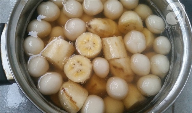 Khi viên bột nếp nổi lên thì cho tiếp phần chuối đã ướp đường vào, khuấy nhẹ tay vì chuối rất dễ bị nát. Cuối cùng cho bột báng vào.