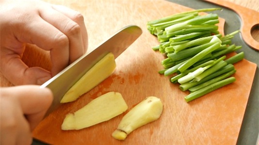 Chuẩn bị gừng thái mỏng và hành lá cắt khúc tầm 4-5cm.