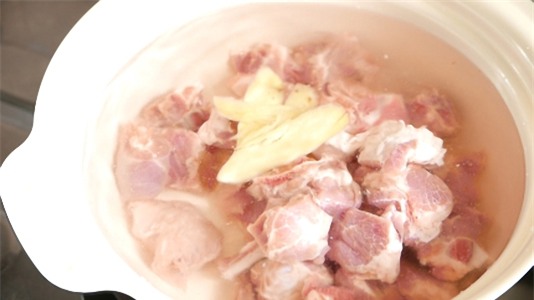 Bắc nồi nước cùng 1-2 lát gừng lên bếp, khi nước sôi thì cho sườn vào trụng sơ trong 1-2 phút sau đó bạn trút sườn ra, sửa lại bằng nước lạnh rồi để ráo sườn.