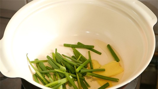Bắc nồi lên bếp cùng chút dầu ăn, khi dầu nóng đều thì cho hành lá và gừng vào phi thơm trong 1-2 phút.