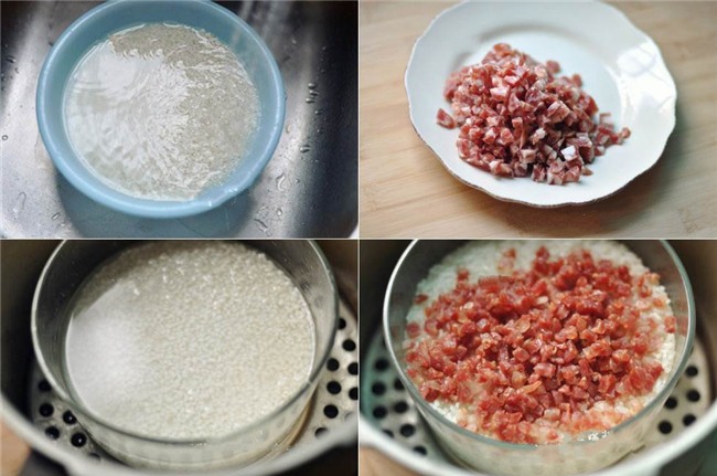 Gạo nếp vo sạch, ngâm nước khoảng 10-15 phút. Lạp xưởng cắt hạt lựu. Cho gạo nếp vào khay cùng với lượng nước xâm xấp mặt gạo, tiếp đó cho lạp xưởng lên trên. Cuối cùng bạn cho khay gạo và lạp xưởng vào nồi hấp hấp chín thành xôi.
