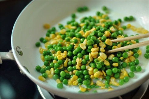Đun nóng một ít dầu ăn trong chảo, cho ngô và đậu hà lan vào xào chín, bạn nêm thêm ít muối cho vừa ăn.