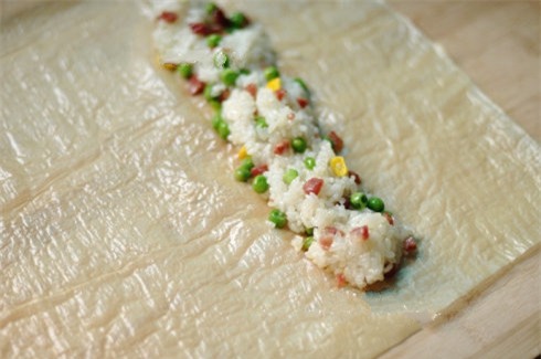 Trải miếng váng đậu ra thớt, múc từng muỗng xôi trộn vào dàn đều rồi cuộn tròn lại.