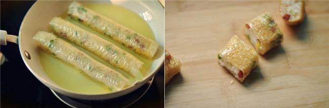Đun nóng dầu ăn trong chảo, cho xôi cuộn váng đậu vào chiên cho đến khi chín vàng đều thì vớt ra. Cắt xôi cuộn váng đậu thành miếng vừa ăn là xong.