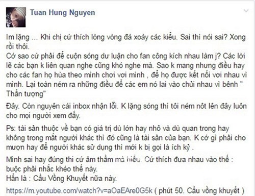 'đá xoáy'. Anh nói rằng Thu Phương đã inbox xin lỗi nhưng vẫn lên