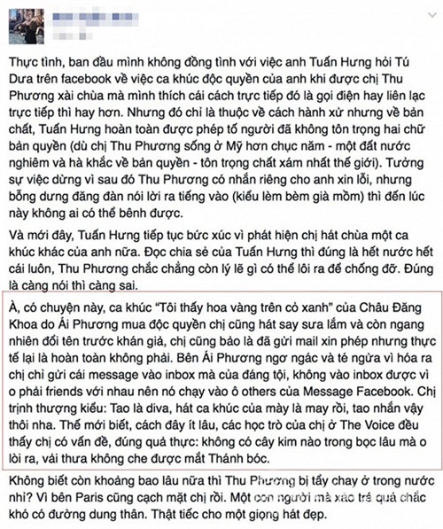 khuyết' cũng bị Thu Phương hát mà không xin phép Tuấn Hưng.