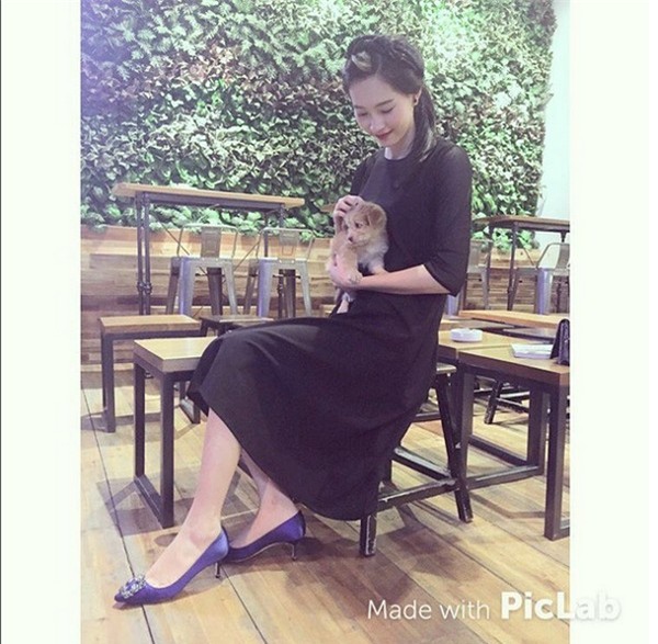 Thảo mặc đầm đen trơn đi giày Manolo Blahnik màu xanh giúp cho set đồ