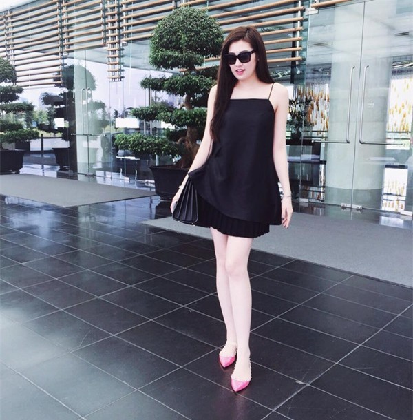 hậu Tú Anh kết hợp áo camisole đen dáng suông dài với chân váy xếp ly