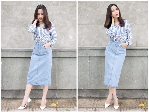 áo sơ mi sọc xanh cùng tông váy, áo được ca sĩ buộc vạt khoe thân hình