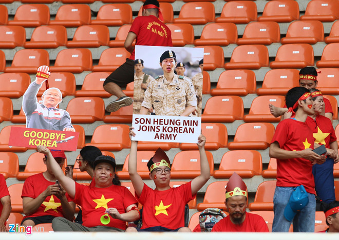 Muôn màu cách cổ vũ của người hâm mộ Việt Nam tại SVĐ Pakan Sari. Một CĐV trẻ mang tấm biển có nội dung: "Son Heung-min sẽ phải đi nghĩa vụ quân sự". Ảnh: Quang Thịnh, Việt Hùng (từ Indonesia).