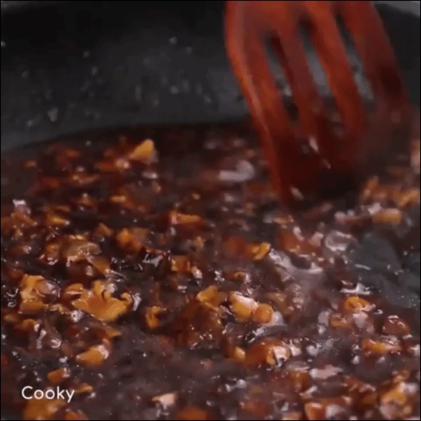 Cho vào chảo 1 thìa cà phê dầu ăn, 1/2 lượng hành khô và tỏi đã băm. Khi hành tỏi dậy mùi thơm, cho vào chảo 1/2 phần nấm hương khô, mộc nhĩ đã băm nhỏ, 1 thìa cà phê nước tương cùng bát bột bắp đã trộn và 1/2 thìa cà phê dầu hào. Khuấy đều cho đến khi hỗn hợp sôi lăn tăn.