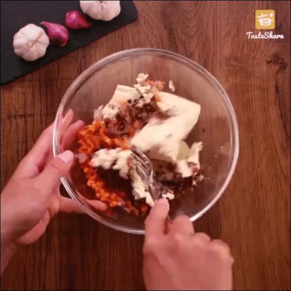 Cho đậu hũ đã rửa sạch vào bát cùng phần mộc nhĩ, nấm hương và hành khô còn lại, thêm cả cà rốt đã băm nhỏ. Thêm vào bát 1/2 thìa cà phê hạt tiêu xay, 1 thìa cà phê dầu mè, 1/2 thìa cà phê hạt nêm, 1/2 thìa cà phê đường kính. Dùng dĩa hoặc thìa dằm nát đậu hũ và trộn đều các nguyên liệu.