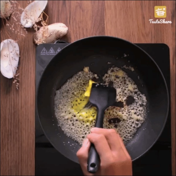 Cho 1 thìa cà phê dầu ăn vào chảo và phi thơm phần tỏi băm còn lại. Khi tỏi dậy mùi thơm, bạn thêm 2-3 thìa cà phê bơ lạt vào và khuấy đều cho bơ tan ra.