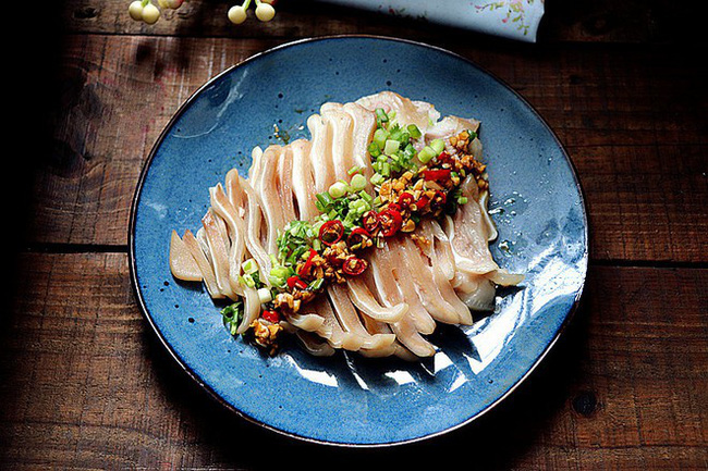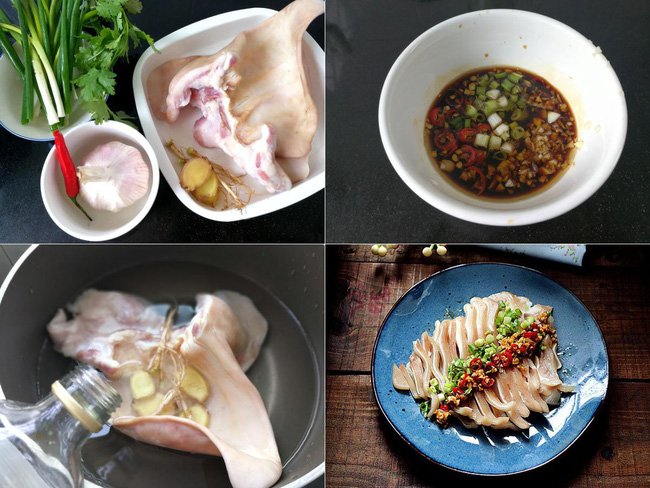 Tỏi băm nhỏ, ớt và hành lá thái nhỏ. Cho tỏi, ớt, hành vào bát rồi thêm nước tương, dầu hào, đường, dầu mè vào trộn đều. Tai lợn rửa sạch cho vào nồi, thêm rượu nấu ăn, muối, gừng, rau mùi và lượng nước thích hợp vào luộc cho đến khi tai lợn chín (khoảng 45 phút) thì lấy ra để nguội. Thái tai lợn thành miếng vừa ăn, cho ra đĩa rồi đổ đều hỗn hợp nước tương đã pha lên trên.