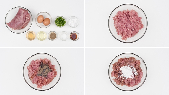 Bước 1: Thịt lợn rửa sạch, băm nhỏ rồi cho vào bát. Thêm muối, bột tiêu, nước tương, dầu ăn vào rồi trộn đều. Tiếp đó thêm tinh bột và một chút nước lọc vào trộn chung.