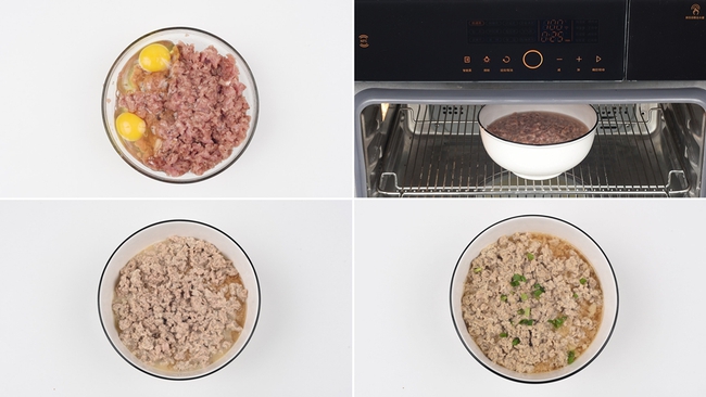 Bước 2: Đập trứng vào bát thịt rồi trộn đều. Thêm lượng nước ngập mặt thịt. Cho bát thịt vào nồi hấp đã đun sôi hoặc lò hấp. Hấp khoảng 15 phút là thịt chín, lấy bát thịt ra đảo đều rồi rưới dầu mè lên trên. Tiếp đó lại cho bát thịt vào nồi hấp tiếp cho đến khi thịt chín hoàn toàn thì rắc thêm hành lá thái nhỏ vào.